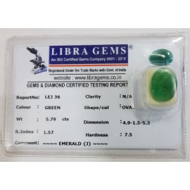 REPORT NO . LEJ 36CLARITY . N/ACOLOUR . GREENSHAPE / CUT . OVALWT . 5.79 CTSDIMENSION . 4-9.1-5.5-3.R . INDEX . 1.57HARDNESS . 7.5COMMENT . EMERALD ( J )..