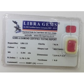REPORT NO . LRA 15CLARITY . N/ACOLOUR . PINKSHAPE / CUT . RECTANGLEWT . 5.94 CTSDIMENSION . 2-9.9-7.3-9.R . INDEX . 1.76-1.78HARDNESS . 9.0COMMENT . RUBY {A }..