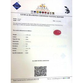 REPORT NO . LR 215CLARITY . N/ACOLOUR . PINKSHAPE / CUT . OVALWT . 4.15 CTSDIMENSION . 9-8.8-1.5-2.R . INDEX . 1.76-1.78HARDNESS . 9.0COMMENT . RUBY..