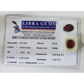 REPORT NO .LH 186CLARITY . N/ACOLOUR . COCA COLASHAPE / CUT . OVALWT . 4.34 CTSDIMENSION . 9-9.8-9.5-7.R . INDEX . 1.92-2.02HARDNESS . 6.5-7.5COMMENT . HESSONITE..