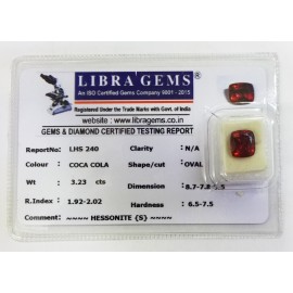 REPORT.NO.LHS 240CLARITY.N/ACOLOUR.COCA COLASHAPE/CUT.OVALWT.3.23 CTSDIMENSION.8.7-7.8-5.5R.INDEX.1.92-2.02HARDNESS.6.5-7.5COMMENT.HESSONITE {S}..