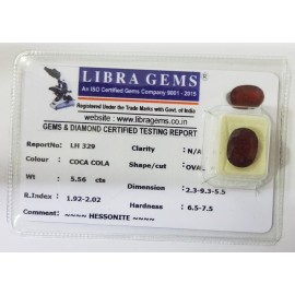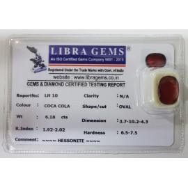 REPORT NO . LH 10CLARITY . N/ACOLOUR . COCA COLASHAPE / CUT . OVALWT . 6.18 CTSDIMENSION . 3-7.10-2.4-3.R . INDEX . 1.92-2.02HARDNESS . 6.5-7.5COMMENT . HESSONITE..