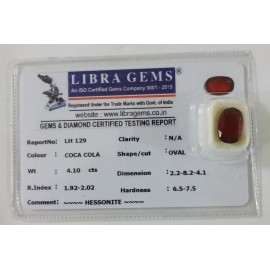 REPORT NO . LH 129CLARITY . N/ACOLOUR . COCA COLASHAPE / CUT . OVALWT . 4.10 CTSDIMENSION . 2-2.8-2.4-1.R . INDEX . 1.92-2.02HARDNESS . 6.5-7.5COMMENT . HESSONITE..