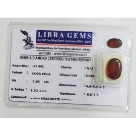 REPORT.NO.-LH 441CLARITY.-N/ACOLOUR.-COCA COLASHAPE/CUT.-OVALWT.-7.85 CTSDIMENSION.-4-6.9-9.5-6.R.INDEX.-1.92-2.02HARDNESS.-6.5-7.5COMMENT.-HESSONITE..