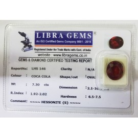 REPORT.NO.-LHS 146CLARITY.-N/ACOLOUR.-COCXA COLASHAPE/CUT.-OVALWT.-7.30 CTSDIMENSION.-2.1-10.5-6.6R.INDEX.-1.92-2.02HARDNESS.-6.5-7.5COMMENT.-HESSONITE {S}..