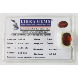 REPORT NO . LHS 34CLARITY . N/ACOLOUR . COCA COLASHAPE / CUT . OVALWT . 11.01 CTSDIMENSION . 5-5.10-8.7-1.R . INDEX . 1.92-2.02HARDNESS . 6.5-7.5COMMENT . HESSONITE { S }..