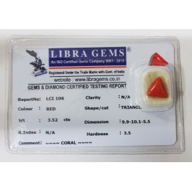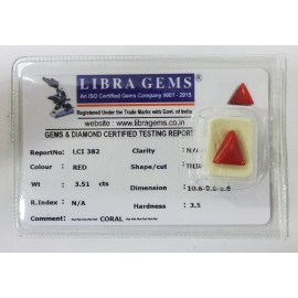 REPORT NO . LCI 382CLARITY . N/ACOLOUR . REDSHAPE / CUT . TRIANGLEWT . 3.51 CTSDIMENSION . 10-8.9-6.5-6.R . INDEX . N/AHARDNESS . 3.5COMMENT . CORAL..