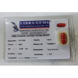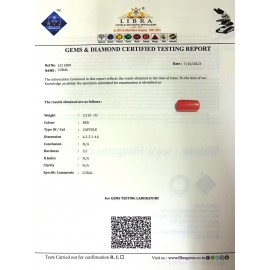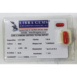 REPORT NO . LCI 220CLARITY . N/ACOLOUR . REDSHAPE / CUT . CAPSULEWT . 4.94 CTSDIMENSION . 6-5.5-4.6-1.R . INDEX . N/AHARDNESS . 3.5COMMENT . CORAL..