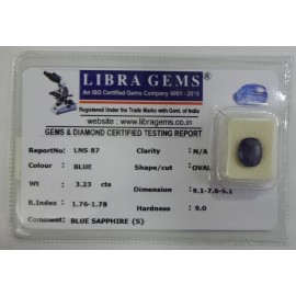REPORT.NO.-LNS 87CLARITY.-N/ACOLOUR.-BLUESHAPE/CUT.-OVALWT.-3.23 CTSDIMENSION.-9-1.7-6.5-1.R.INDEX.-1.76-1.78HARDNESS.-9.0COMMENT.-BLUE SAPPHIRE { S }..