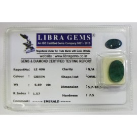 REPORT NO . LE 80CLARITY . N/ACOLOUR . GREENSHAPE / CUT . OVALWT . 3.33 CTSDIMENSION . 1-6.9-3.4-9.R . INDEX . 1.57HARDNESS . 7.5COMMENT . EMERALD..