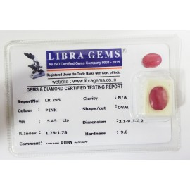 REPORT.NO.-LR 295CLARITY.-N/ACOLOUR.-PINKSHAPE/CUT.-OVALWT.-5.45 CTSDIMENSION.-2.1-9.3-4.2R.INDEX.-1.76-1.78HARDNESS.-9.0COMMENT.-RUBY..