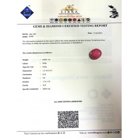 REPORT NO . LRA 20CLARITY . N/ACOLOUR . PINKSHAPE / CUT . OVALWT . 4.37 CTSDIMENSION . 10-2.7-8.5-4.R . INDEX . 1.76-1.78HARDNESS . 9.0COMMENT . RUBY { A }..