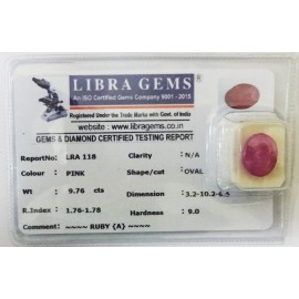 REPORT.NO.-LRA 118CLARITY.-N/ACOLOUR.-PINKSHAPE/CUT.-OVALWT.-9.76 CTSDIMENSION.-3-2.10-2.6-5.R.INDEX.-1.76-1.78HARDNESS.-9.0COMMENT.-RUBY { A }..