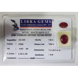 REPORT NO . LR 249CLARITY . N/ACOLOUR . PINKSHAPE / CUT . OVALWT . 4.83 CTSDIMENSION . 1-1.8-7.5-6.R . INDEX . 1.76-1.78HARDNESS . 9.0COMMENT . RUBY..