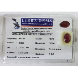 REPORT NO . LR 29CLARITY . N/ACOLOUR . PINKSHAPE / CUT . OVALWT . 5.25 CTSDIMENSION . 1-3.8-2.5-6.R . INDEX . 1.76-1.78HARDNESS . 9.0COMMENT . RUBY..