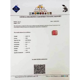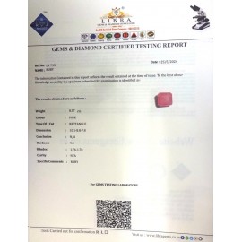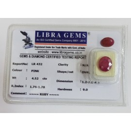 REPORT.NO.-LR 432CLARITY.-N/ACOLOUR.-PINKSHAPE/CUT.-OVALWT.-4.52 CTSDIMENSION.-1-2.9-5.4-3.R.INDEX.-1.76-1.78HARDNESS.-9.0COMMENT.-RUBY..