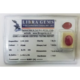 REPORT.NO.-LRA 142CLARITY.-N/ACOLOUR.-PINKSHAPE/CUT.-OVALWT.-8.75 CTSDIMENSION.-2-8.9-4.7-7.R.INDEX.-1.76-1.78HARDNESS.-9.0COMMENT.-RUBY { A }..