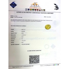 REPORT.NO.LYA 80CLARITY.N/ACOLOUR.YELLOWSHAPE/CUT.OVALWT.4.65 CTSDIMENSION.9.7-8.4-6.6R.INDEX.1.76-1.78HARDNESS.9.0COMMENT.YELLOW SAPPHIRE {A}..