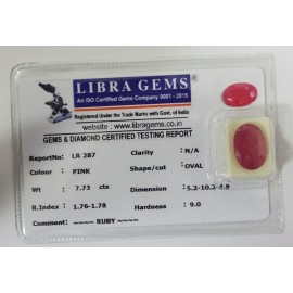 REPORT.NO.-LR 287CLARITY.-N/ACOLOUR.-PINKSHAPE/CUT.-OVALWT.-7.73DIMENSION.-5.2-10.2-4.8R.INDEX.-1.76-1.78HARDNESS.-9.0COMMENT.-RUBY..