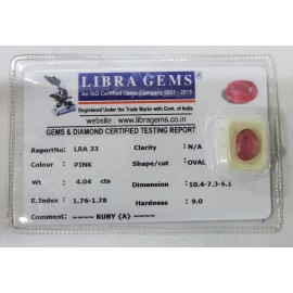 REPORT. NO. LRA 33CLARITY. N/ACOLOUR. PINKSHAPE/CUT. OVALWT. 4.04 CTSDIMENSION. 10.4-7.3-5.1R.INDEX. 1.76-1.78HARDNESS. 9.0COMMENT. RUBY{A}..