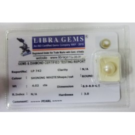 REPORT NO . LP 742CLARITY . N/ACOLOUR . SHINING WHITESHAPE / CUT . ROUNDWT . 4.02 CTSDIMENSION . 8-9.8-9.6-5.R . INDEX . N/AHARDNESS . 3.0COMMENT . PEARL..