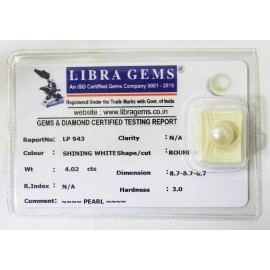 REPORT.NO-LP 943CLARITY-N/ACOLOUR-SHINING WHITESHAPE/CUT-ROUNDWT-4.02 CTSDIMENSION-8.7-8.7-6.7R.INDEX-N/AHARDNESS-3.0COMMENT-PEARL..