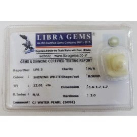 REPORT NO . LPS 3CLARITY . N/ACOLOUR . SHINING WHITESHAPE / CUT . ROUNDWT . 12.01 CTSDIMENSION . 1-6.1-7.1-7.R . INDEX . N/AHARDNESS . 3.0COMMENT . C / WATER PEARL { SOSI }..