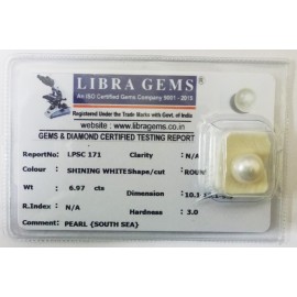 REPORT.NO.LPSC 171CLARITY.N/ACOLOUR.SHINING WHITESHAPE/CUT.ROUNDWT.6.97 CTSDIMENSION.10.1-10.1-9.9R.INDEX.N/AHARDNESS.3.0COMMENT.PEARL{SOUTH SEA}..