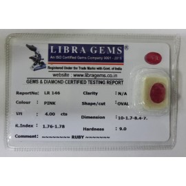 REPORT NO . LR 146CLARITY . N/ACOLOUR . PINKSHAPE / CUT . OVALWT . 4.00 CTSDIMENSION . 10-1.7-8.4-7.R . INDEX . 1.76-1.78HARDNESS . 9.0COMMENT . RUBY..