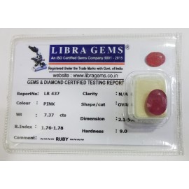 REPORT.NO.-LR 437CLARITY.-N/ACOLOUR.-PINKSHAPE/CUT.-OVALWT.-7.37 CTSDIMENSION.-2-1.9-4.6-2.R.INDEX.-1.76-1.78HARDNESS.-9.0COMMENT.-RUBY..