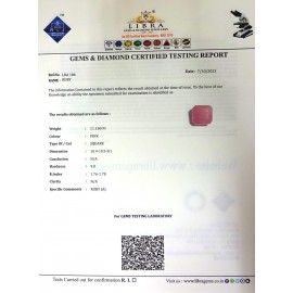 REPORT NO . LR 29CLARITY . N/ACOLOUR . PINKSHAPE / CUT . OVALWT . 5.25 CTSDIMENSION . 1-3.8-2.5-6.R . INDEX . 1.76-1.78HARDNESS . 9.0COMMENT . RUBY..