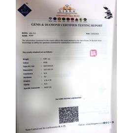 REPORT.NO.-LR 432CLARITY.-N/ACOLOUR.-PINKSHAPE/CUT.-OVALWT.-4.52 CTSDIMENSION.-1-2.9-5.4-3.R.INDEX.-1.76-1.78HARDNESS.-9.0COMMENT.-RUBY..