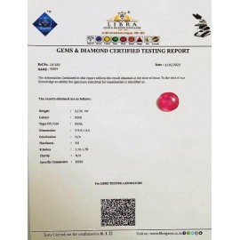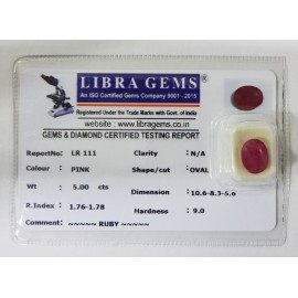 REPORT NO . LR 111CLARITY . N/ACOLOUR . PINKSHAPE / CUT . OVALWT . 5.00 CTSDIMENSION . 10-6.8-3.5-6.R . INDEX . 1.76-1.78HARDNESS . 9.0COMMENT . RUBY..