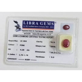 REPORT.NO.-LR 404CLARITY.-N/ACOLOUR.-PINKSHAPE/CUT.-OVALWT.-4.28 CTSDIMENSION.-10-2.8-1.5-2.R.INDEX.-1.76-1.78HARDNESS.-9.0COMMENT.-RUBY..