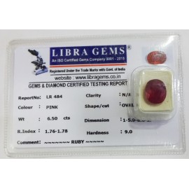 REPORT.NO.LR 484CLARITY.N/ACOLOUR.PINKSHAPE/CUT.OVALWT.6.50 CTSDIMENSION.1.5-9.8-6.2R.INDEX.1.76-1.78HARDNESS.9.0COMMENT.RUBY..