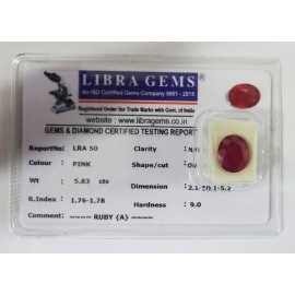 REPORT NO . LRA 50CLARITY . N/ACOLOUR . PINKSHAPE / CUT . OVALWT . 5.83 CTSDIMENSION . 2-1.10-1.5-2.R . INDEX . 1.76-1.78HARDNESS . 9.0COMMENT . RUBY { A }..