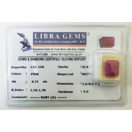 REPORT.NO.-LRA 158CLARITY.-N/ACOLOUR.-PINKSHAPE/CUT.-RECTANGLEWT.-9.71 CTSDIMENSION.-1-6.9-9.7-1.R.INDEX.-1.76-1.78HARDNESS.-9.0COMMENT.-RUBY { A }..