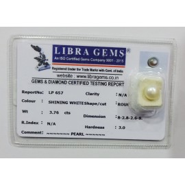 REPORT NO . LP 444CLARITY . N/ACOLOUR . SHINING WHITESHAPE / CUT . ROUNDWT . 3.76 CTSDIMENSION . 8-7.6-4.8-7.R . INDEX . N/AHARDNESS . 3.0COMMENT . PEARL..