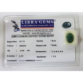 REPORT NO . LE 11CLARITY  . N/ACOLOUR . GREENSHAPE / CUT . OVALWT . 2.96 CTSDIMENSION . 1-3.8-2.4-5.R . INDEX . 1.57HARDNESS . 7.5COMMENT . EMERALD..