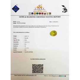 REPORT.NO.-LYS 109CLARITY.-N/ACOLOUR.-L. YELLOWSHAPE/CUT.-OVALWT.-2.70 CTSDIMENSION.-9-6.6-9.4-1.R.INDEX.-1.76-1.78HARDNESS.-9.0COMMENT.-YELLOW SAPPHIRE { S }..