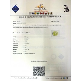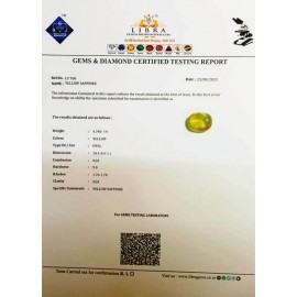 REPORT NO . LY 268CLARITY . N/ACOLOUR . YELLOWSHAPE / CUT . OVALWT . 4.34 CTSDIMENSION . 1-5.9-1.4-1.R . INDEX . 1.76-1.78HARDNESS . 9.0COMMENT . YELLOW SAPPHIRE..