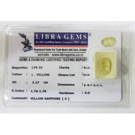 REPORT NO . LYS 32CLARITY . N/ACOLOUR . L . YELLOWSHAPE / CUT . OVALWT . 5.27 CTSDIMENSION . 1-4.7-6.5-1.R . INDEX . 1.76-1.78HARDNESS . 9.0COMMENT . YELLOW SAPPHIRE { S }..