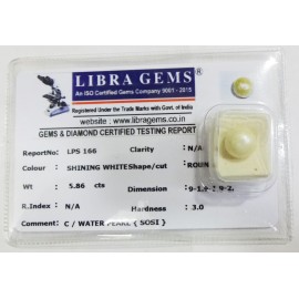 REPORT NO . LPS 166CLARITY . N/ACOLOUR . SHINING WHITESHAPE / CUT . ROUNDWT . 5.86 CTSDIMENSION . 9-1.9-1.9-2.R . INDEX . N/AHARDNESS . 3.0COMMENT . C / WATER PEARL { SOSI }..