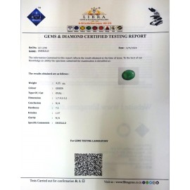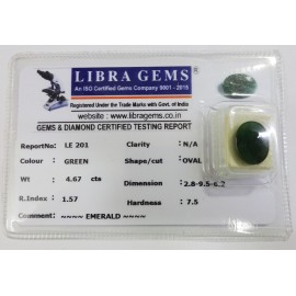 REPORT.NO.-LE 201CLARITY.-N/ACOLOUR.-GREENSHAPE/CUT.-OVALWT.-4.67 CTSDIMENSION.-2.8-9.5-6.2R.INDEX.-1.57HARDNESS.-7.5COMMENT.-EMERALD..