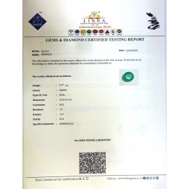 REPORT.NO.LE 585CLARITY.N/ACOLOUR.GREENSHAPE/CUT.OVALWT.3.20 CTSDIMENSION.1.4-8.7-4.9R.INDEX.1.57HARDNESS.7.5COMMENT.EMERALD ..