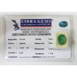 REPORT NO . LEJ 61CLARITY . N/ACOLOUR . GREENSHAPE / CUT . OVALWT . 5.03 CTSDIMENSION . 2-9.9-7.6-1.R . INDEX . 1.57HARDNESS . 7.5COMMENT . EMERALD { J }..