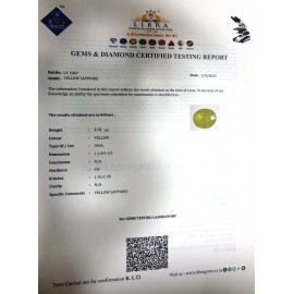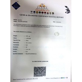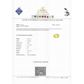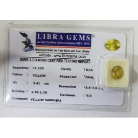 REPORT NO . LY 339CLARITY . N/ACOLOUR . YELLOWSHAPE / CUT . OVALWT . 3.41 CTSDIMENSION . 8-9.7-6.5-1.R . INDEX . 1.76-1.78HARDNESS . 9.0COMMENT . YELLOW SAPPHIRE..