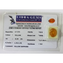 REPORT.NO.LY 374CLARITY.N/ACOLOUR.YELLOWSHAPE/CUT.OVALWT.8.30 CTSDIMENSION.2.7-10.4-6.6R.INDEX.1.76-1.78HARDNESS.9.0COMMENT.YELLOW SAPPHIRE..