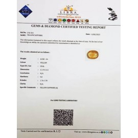REPORT.NO.LYA 267CLARITY.N/ACOLOUR.YELLOW SHAPE/CUT.OVALWT.5.07 CTSDIMENSION.3.7-8.4-4.2R.INDEX.1.76-1.78HARDNESS.9.0COMMENT.YELLOW SAPPHIRE {A}..