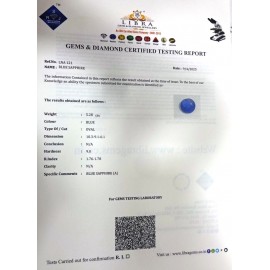 DATE: 9-4-2025REF.NO: LNA 121NAME: BLUE SAPPHIREWEIGHT: 5.28 CTSCOLOUR: L.BLUETYPE OF/CUT: OVALDIMENSION: 10.3-9.1-6.1/CONCLUSION: N/AHARDNESS: 9.0R.INDEX: 1.76-1.78CLARITY: N/ASPECIFIC COMMENTS: BLUE..